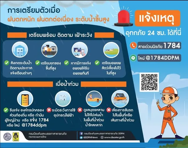 ติดตามข่าวสารจากทางราชการอย่างใกล้ชิด และหลีกเลี่ยงพื้นที่เสี่ยงหากไม่จำเป็น หากพบเหตุฉุกเฉิน โทร สายด่วนนิรภัย 1784 หรือ Line: @1784DDPM