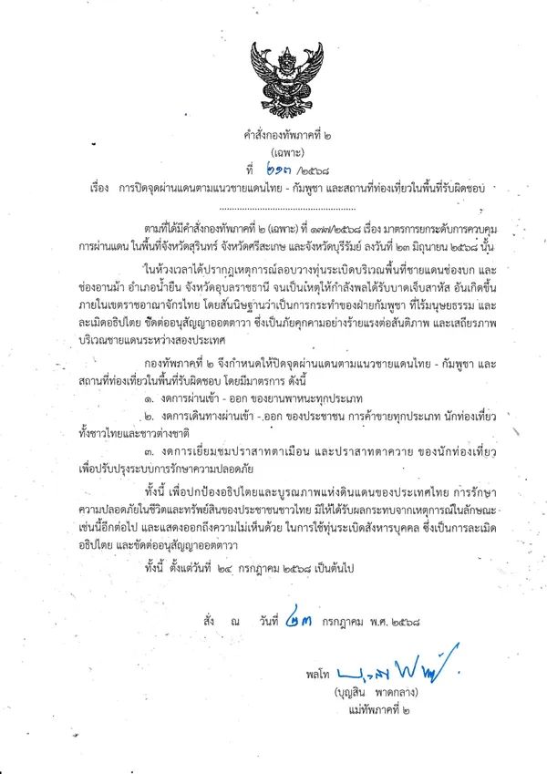 วันที่ 23 กรกฎาคม 2568 พลโท บุญสิน พาดกลาง แม่ทัพภาคที่ 2 ได้ลงนามในคำสั่งกองทัพภาคที่ 2 (เฉพาะ) ที่ 213/2568 เรื่องการปิดจุดผ่านแดนไทย-กัมพูชา และสถานที่ท่องเที่ยวในพื้นที่รับผิดชอบ โดยมีผลตั้งแต่วันที่ 24 กรกฎาคม 2568 เป็นต้นไป