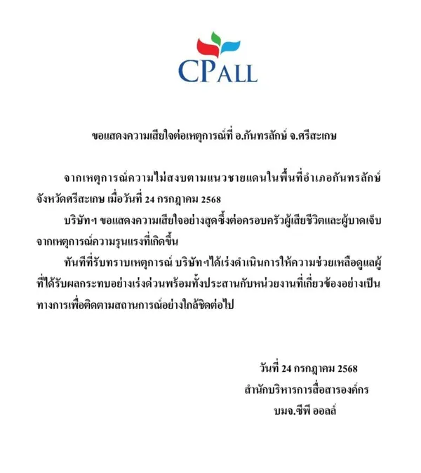 จากเหตุการณ์ความไม่สงบตามแนวชายแดนในพื้นที่อำเภอกันทรลักษ์ จังหวัดศรีสะเกษ เมื่อวันที่ 24 กรกฎาคม 2568 บริษัทฯ ขอแสดงความเสียใจอย่างสุดซึ้งต่อครอบครัวผู้เสียชีวิตและผู้บาดเจ็บจากเหตุการณ์ความรุนแรงที่เกิดขึ้น