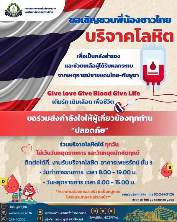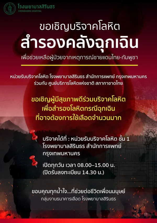ทั้งนี้ ทางกรุงเทพมหานคร (กทม.) ขอเชิญร่วมบริจาคโลหิต เพื่อสำรองช่วยเหลือผู้ได้รับผลกระทบจากเหตุการณ์ชายแดนไทย–กัมพูชา