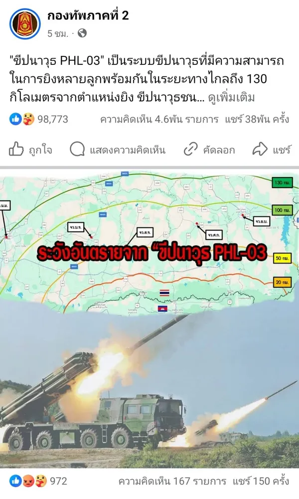 - กองทัพภาคที่ 2 เตือนกัมพูชาจ่อใช้อาวุธวิถีโค้งโต้กลับหลังไทยยึดภูมะเขือ