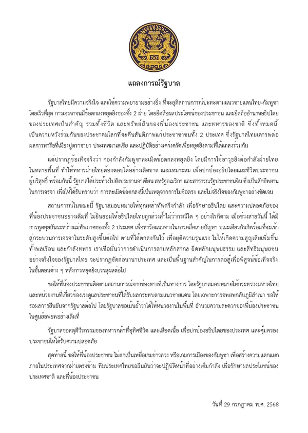 วันที่ 29 กรกฎาคม 2568 เวลา 13.20 น. ณ ตึกนารีสโมสร ทำเนียบรัฐบาล นายภูมิธรรม เวชยชัย รักษาการนายกรัฐมนตรี พร้อมรัฐมนตรีฝ่ายความมั่นคงและคณะทีมไทยแลนด์ ร่วมแถลงถึงจุดยืนและท่าทีของรัฐบาลไทยต่อสถานการณ์ชายแดนไทย–กัมพูชาที่กลับมาตึงเครียดอีกครั้ง แม้จะมีข้อตกลงหยุดยิงร่วมกันหลังการหารือในมาเลเซีย