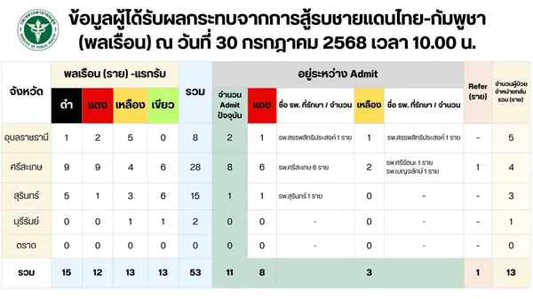 ยอดผู้ป่วยจากเหตุสู้รบที่เข้ารับการดูแลในโรงพยาบาล 34 แห่ง รวมทั้งสิ้น 744 ราย กระจายอยู่ใน 7 จังหวัดชายแดน โดยมากที่สุดคือสุรินทร์ 322 ราย รองลงมาคือศรีสะเกษ 204 ราย และบุรีรัมย์ 85 ราย นอกจากนี้ยังมีผู้ป่วยสุขภาพจิตและผู้ใช้สิทธิหลักประกันสุขภาพแห่งชาติรวม 84 ราย