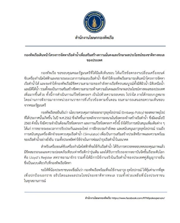 กองทัพเรือ ขอขอบคุณคณะรัฐมนตรีที่ได้มีมติเห็นชอบ ให้แก้ไขข้อตกลงฯเปลี่ยนเครื่องยนต์ขับเครื่องกำเนิดไฟฟ้าและขยายระยะเวลาการส่งมอบเรือดำน้ำ ซึ่งทำให้กองทัพเรือสามารถเดินหน้าโครงการจัดหาเรือดำน้ำได้ และจะทำให้กองทัพเรือมีขีดความสามารถของกำลังทางเรือที่ครบสมบูรณ์ทั้งมิติผิวน้ำ มิติเหนือน้ำ และมิติใต้น้ำ