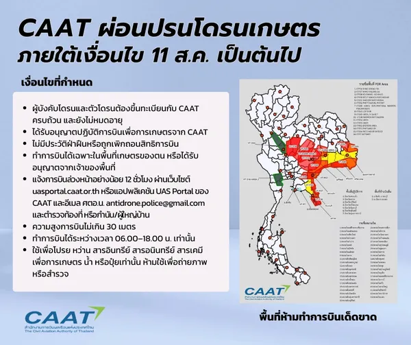 ทั้งนี้ เพื่อความมั่นคงและความปลอดภัยทางการบินในช่วงสถานการณ์ชายแดนไทย–กัมพูชา อย่างไรก็ตาม ตั้งแต่วันที่ 11 สิงหาคม 2568 เป็นต้นไป CAAT จะผ่อนปรนอนุญาตเฉพาะการบินโดรนเพื่อการเกษตร ภายใต้เงื่อนไขที่กำหนด ได้แก่