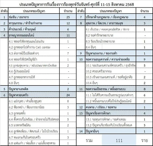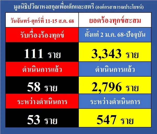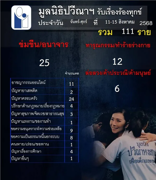 มูลนิธิปวีณาหงสกุลเพื่อเด็กและสตรี รายงานสถิติการรับเรื่องร้องทุกข์ประจำวันที่ 11–15 สิงหาคม 2568 มีจำนวนรวมทั้งสิ้น 111 เรื่อง โดยประเภทปัญหาที่ถูกร้องเรียนมากที่สุดคือ ข่มขืน/อนาจาร 25 เรื่อง ตามมาด้วย ทารุณกรรม/ทำร้ายร่างกาย 12 เรื่อง และ ปัญหาครอบครัว 24 เรื่อง