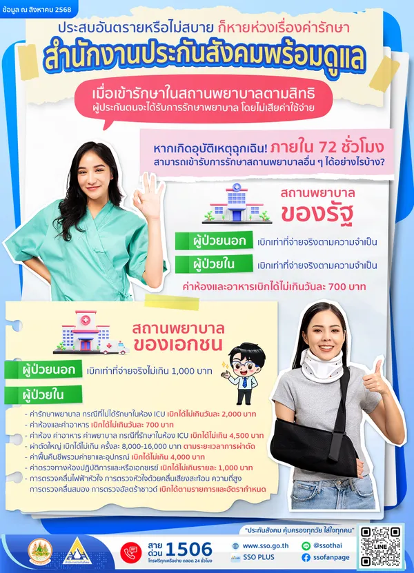 สำนักงานประกันสังคม กระทรวงแรงงาน เผยแพร่ข้อมูลระบุว่า ผู้ประกันตนอุ่นใจได้เลย เพราะหากเจ็บป่วยหรือประสบอันตราย สำนักงานประกันสังคมก็พร้อมดูแลค่ารักษา