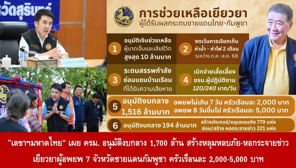 นายชนินทร์ รุ่งธนเกียรติ เลขานุการรัฐมนตรีว่าการกระทรวงมหาดไทย กล่าวถึงภาพรวมการช่วยเหลือเยียวยาผู้ได้รับผลกระทบจากสถานการณ์การปะทะระหว่างไทยและกัมพูชาในพื้นที่ 7 จังหวัดชายแดนว่า นายภูมิธรรม เวชยชัย รองนายกรัฐมนตรีและรัฐมนตรีว่าการกระทรวงมหาดไทย ได้มีข้อสั่งการให้ดำเนินการช่วยเหลืออย่างต่อเนื่อง ตั้งแต่ช่วงต้นของการปะทะ โดยได้ประสานอนุมัติขยายวงเงินทดรองจ่ายภายใต้อำนาจของผู้ว่าราชการจังหวัด เป็นจังหวัดละ 100 ล้านบาทโดยทันที ซึ่งได้ใช้เพื่อสนับสนุนการอพยพ การบริหารจัดการศูนย์พักพิงผู้อพยพ ซ่อมแซมหลุมหลบภัย ตลอดจนการส่งคนกลับบ้าน และคืนสภาพสังคมที่ดำเนินการอยู่ในปัจจุบัน ซึ่งขณะนี้มียอดเบิกจ่ายแล้วรวม 198,418,791 บาท