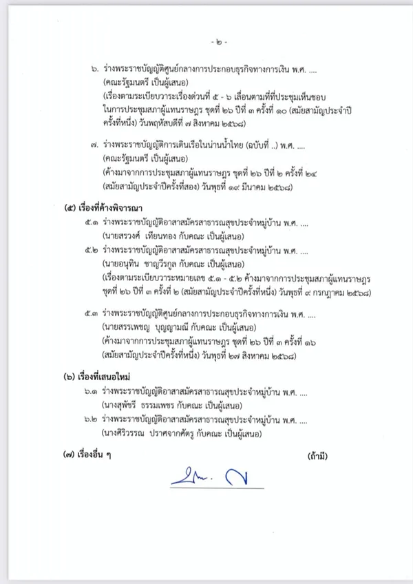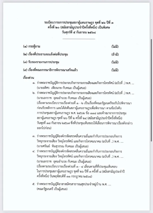 หนังสือระบุว่า การประชุมดังกล่าวจะมีการพิจารณาร่างพระราชบัญญัติสำคัญหลายฉบับ โดยเฉพาะวาระด่วน อาทิ ร่างพระราชบัญญัติการประกอบกิจการกระจายเสียงและโทรทัศน์ ร่างพระราชบัญญัติการจัดสรรคลื่นความถี่ และร่างพระราชบัญญัติศูนย์กลางการประกอบธุรกิจทางการเงิน