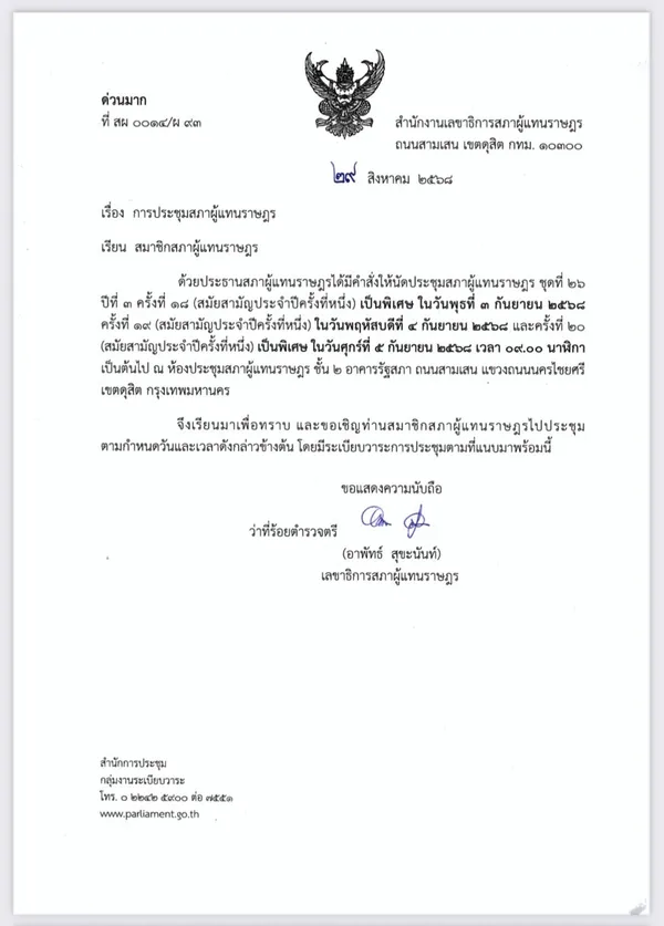สำนักงานเลขาธิการสภาผู้แทนราษฎร มีหนังสือด่วนที่สุดถึงสมาชิกสภาผู้แทนราษฎร นัดประชุมสภาผู้แทนราษฎร ชุดที่ 26 ปีที่ 3 ครั้งที่ 18–20 (สมัยสามัญประจำปีครั้งที่หนึ่ง) เป็นวาระพิเศษ ระหว่างวันที่ 3–5 กันยายน 2568 เวลา 09.00 น. ณ ห้องประชุมสภาผู้แทนราษฎร อาคารรัฐสภา