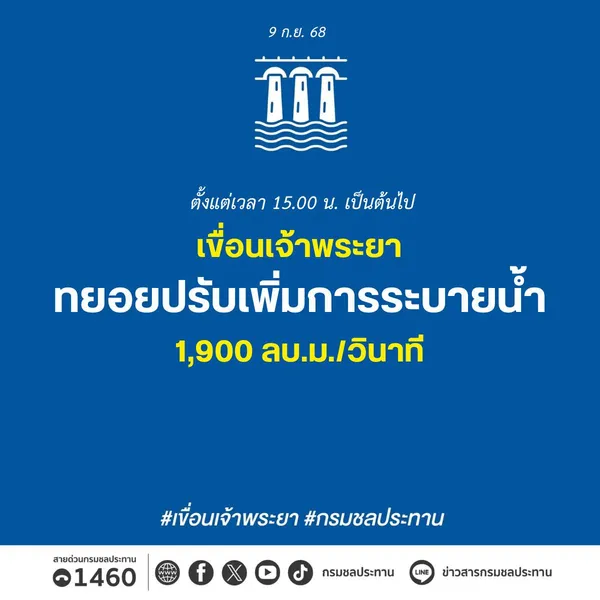 วันนี้(9 ก.ย.68) เขื่อนเจ้าพระยา จะทยอยปรับเพิ่มการระบายน้ำจากอัตรา 1,800 ลบ.ม./วินาที เป็น 1,900 ลบ.ม./วินาที ภายในเวลา 21.00 น. ของวันนี้ และคงอัตราการระบายต่อเนื่อง