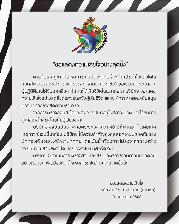 วันที่ 10 กันยายน 2568 บริษัท ซาฟารีเวิลด์ จำกัด (มหาชน) ออกแถลงการณ์กรณีเกิดอุบัติเหตุร้ายแรงกับเจ้าหน้าที่ผู้ปฏิบัติงานในโซนสิงโต โดยระบุว่า พนักงานได้รับบาดเจ็บสาหัสและเสียชีวิตในเวลาต่อมา บริษัทฯ ขอแสดงความเสียใจอย่างสุดซึ้งต่อครอบครัวผู้เสียชีวิต พร้อมยืนยันว่าจะให้การดูแลและสนับสนุนครอบครัวอย่างเต็มที่