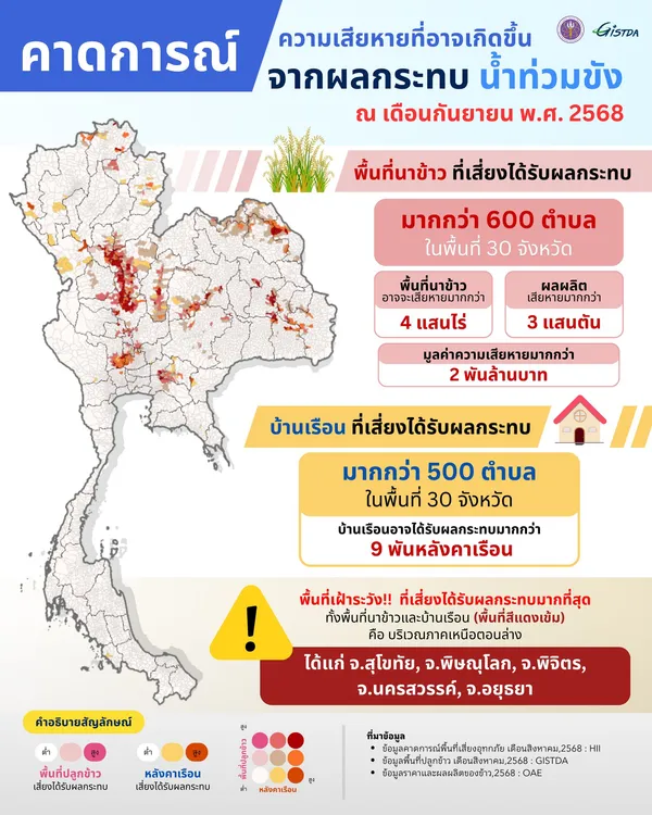 - พื้นที่นาข้าวกว่า 600 ตำบล ใน 33 จังหวัด มีความเสี่ยงถูกน้ำท่วม