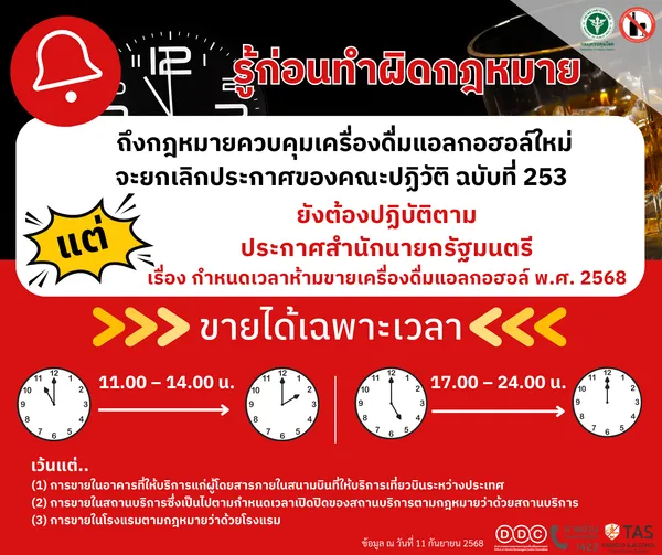 ซึ่งกฎหมายใหม่ยกเลิกประกาศของคณะปฏิวัติ ฉบับที่ 253 และคำสั่ง คสช. 22/2558 แต่ยังห้ามขายในเวลาที่กำหนดตามประกาศสำนักนายกรัฐมนตรี เรื่อง กำหนดเวลาห้ามขายเครื่องดื่มแอลกอฮอล์ พ.ศ. 2568 โดยขายได้เฉพาะเวลาดังนี้ ช่วงกลางวัน เวลา 11.00 - 14.00 น. และช่วงกลางคืน เวลา 17.00 - 24.00 น.