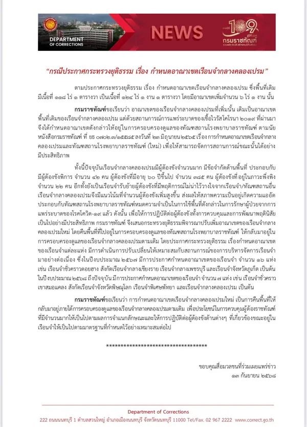 กรมราชทัณฑ์ ขอเรียนว่า อาณาเขตของเรือนจำกลางคลองเปรมที่เพิ่มนั้น เดิมเป็นอาณาเขตพื้นที่เดิมของเรือนจำกลางคลองเปรม แต่ด้วยสถานการณ์การแพร่ระบาดของเชื้อไวรัสโคโรนา 2019 ที่ผ่านมาจึงได้กำหนดอาณาเขตดังกล่าวให้อยู่ในการครอบครองดูแลของทัณฑสถานโรงพยาบาลราชทัณฑ์ ตามนัยหนังสือกรมราชทัณฑ์ ที่ ยธ 0702/15585 ลงวันที่ 23 มิถุนายน 2565 เรื่องการกำหนดอาณาเขตเรือนจำกลาง คลองเปรมและทัณฑสถานโรงพยาบาลราชทัณฑ์ (ใหม่) เพื่อให้สามารถจัดการสถานการณ์ขณะนั้นได้อย่างมีประสิทธิภาพ