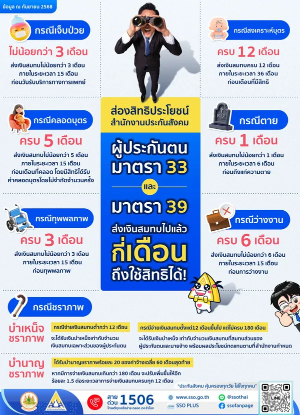 สำนักงานประกันสังคม กระทรวงแรงงาน เผยแพร่ข้อมูลเกี่ยวกับการส่งเงินสมทบของประกันสังคม โดยระบุว่า ผู้ประกันตนเคยสงสัยไหมว่า? ส่งเงินสมทบไปแล้ว กี่เดือนถึงใช้สิทธิได้