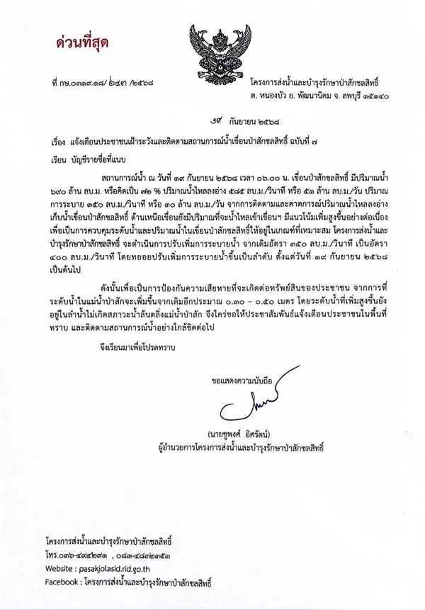 โครงการส่งน้ำและบำรุงรักษาป่าสักชลสิทธิ์ จะดำเนินการปรับเพิ่มการระบายน้ำ จากเดิมอัตรา 350 ลบ.ม./วินาที เป็นอัตรา 400 ลบ.ม./วินาที โดยทยอยปรับเพิ่มการระบายน้ำขึ้นเป็นลำดับ ตั้งแต่วันที่ 19 กันยายน 2568 เป็นต้นไป