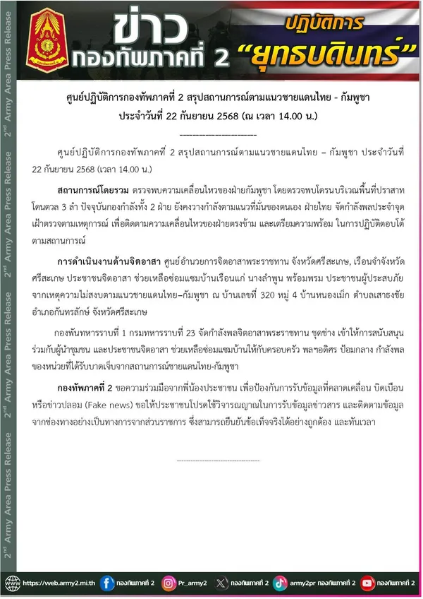 สรุปสถานการณ์ตามแนวชายแดนไทย - กัมพูชา ประจำวันที่ 22 กันยายน 2568