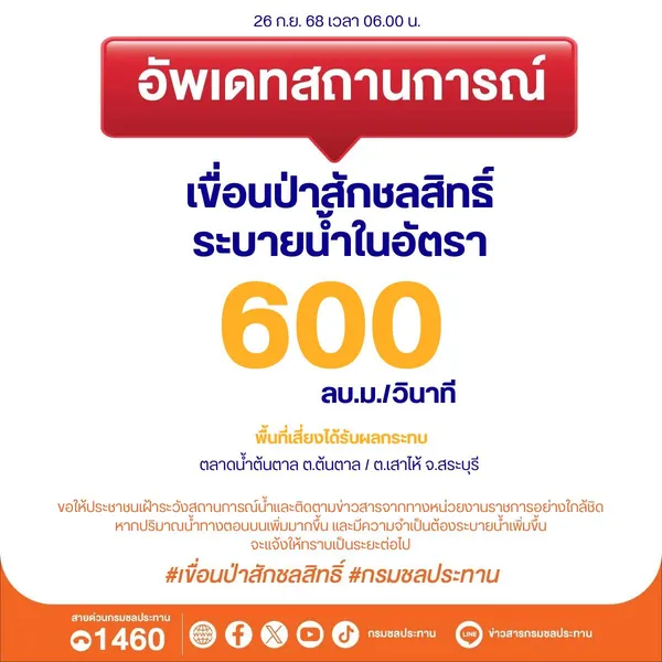 สถานการณ์น้ำเขื่อนป่าสักชลสิทธิ์ 26 กันยายน 2568