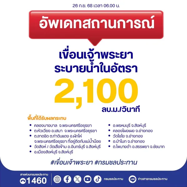 กรมชลประทาน อัปเดตสถานการณ์น้ำเจ้าพระยา 26 กันยายน 2568 เวลา 06.00 น.