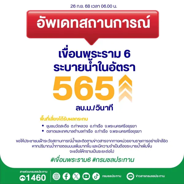 เขื่อนพระราม6 อ.ท่าเรือ จ. พระนครศรีอยุธยา ระบายน้ำในอัตรา 565 ลบ.ม./วินาที