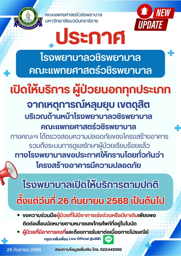 ล่าสุดเพจ คณะแพทยศาสตร์วชิรพยาบาล แจ้งว่า โรงพยาบาลวชิรพยาบาล ทางคณะแพทยศาสตร์วชิรพยาบาล ได้กลับมาเปิดให้บริการผู้ป่วยนอกทุกประเภทรวมถึง คลินิกปฐมภูมิเขตเมืองวชิรพยาบาลตามปกติ ตั้งแต่วันที่ 26 ก.ย.นี้เป็นต้นไป