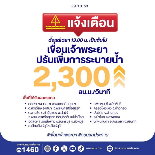 กรมชลประทาน อัปเดตสถานการณ์น้ำเจ้าพระยา ตั้งแต่เวลา 13.00 น.เป็นต้นไป กรมชลประทาน จะทยอยปรับเพิ่มการระบายน้ำผ่านเขื่อนเจ้าพระยา จากอัตรา 2,200 ลบ.ม./วินาที เป็น 2,300 ลบ.ม./วินาที ภายในเวลา 19.00 น. และคงอัตราดังกล่าวต่อเนื่อง เพื่อให้สอดคล้องกับปริมาณน้ำทางตอนบนที่ไหลมาสมทบอย่างต่อเนื่องและฝนที่ตกในระยะนี้