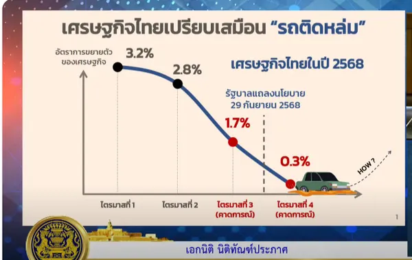 วันที่ 30 กันยายน 2568 นายเอกนิติ นิติทัณฑ์ประภาศ รองนายกรัฐมนตรีและรัฐมนตรีว่าการกระทรวงการคลัง ชี้แจงต่อที่ประชุมรัฐสภาว่า ภาพรวมเศรษฐกิจไทยปี 2568 ชะลอตัวต่อเนื่อง เปรียบเสมือน “รถติดหล่ม” โดยตัวเลขการขยายตัวทางเศรษฐกิจลดจากไตรมาส 1 ที่ 3.2% เหลือ 2.8% ในไตรมาส 2 และคาดการณ์ไตรมาส 3 ราว 1.7% ขณะที่ไตรมาส 4 อาจเหลือเพียง 0.3% สะท้อนกำลังซื้ออ่อนแรง สภาพคล่องตึงตัว หนี้ครัวเรือนสูง และความสามารถในการผลิตถดถอย กระทบตั้งแต่ประชาชน พ่อค้าแม่ค้า ผู้ประกอบการรายย่อย ไปจนถึงธุรกิจขนาดใหญ่