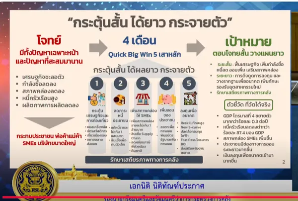 รัฐบาลจึงกำหนดแผนเร่งด่วน “Quick Big Win” ระยะ 4 เดือน (ต.ค. 2568 – ม.ค. 2569) เดินพร้อมกัน 5 เสาหลัก โดยยึดหลัก “กระตุ้นสั้น ได้ยาว และกระจายตัว” ดังนี้