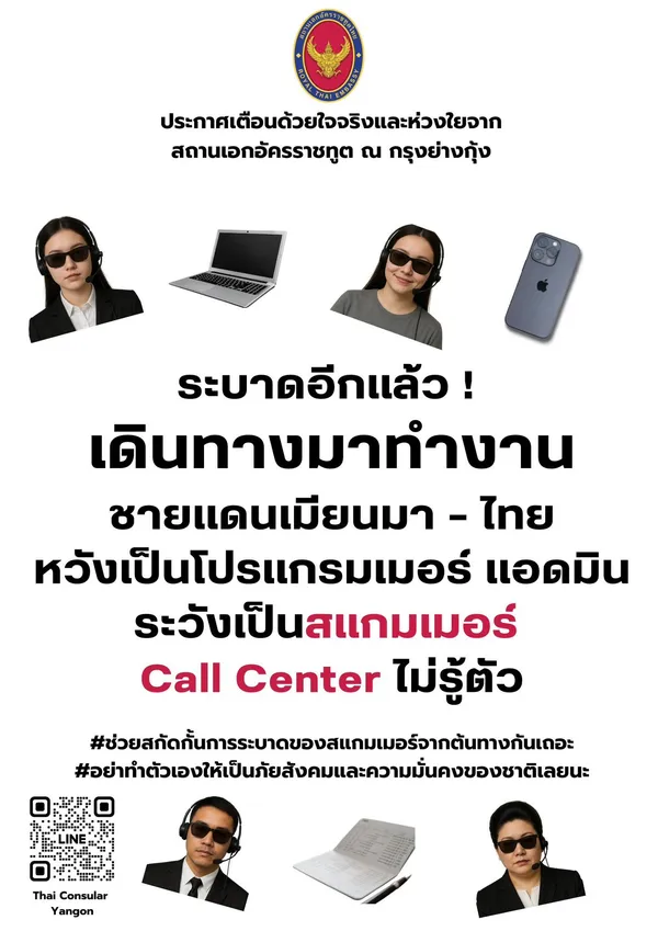สถานเอกอัครราชทูต ณ กรุงย่างกุ้ง ขอแจ้งเตือนพี่น้องชาวไทยที่ได้รับการชักชวนให้เดินทางมาทำงานในพื้นที่ชายแดนเมียนมา–ไทย โดยอ้างว่าจะได้ทำงานเป็นโปรแกรมเมอร์ แอดมินออนไลน์ หรือเทรดบิตคอยน์ ฯลฯ ที่เมียนมา มีรายได้ดี
