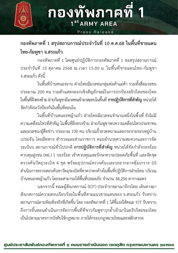 สรุปสถานการณ์ชายแดนไทย–กัมพูชา วันที่ 10 ตุลาคม 2568