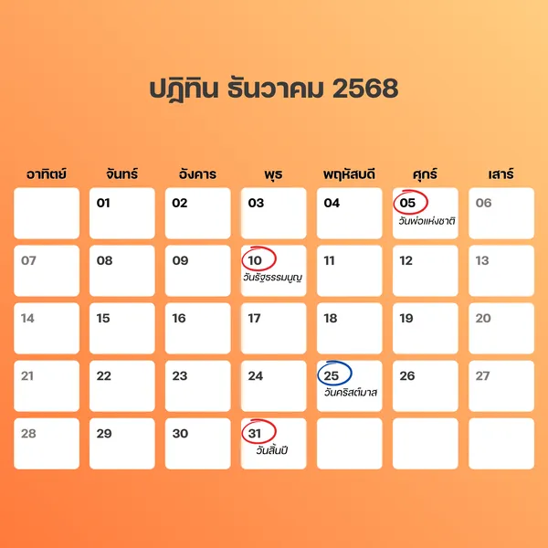 ในบทความนี้ TNN ONLINE ได้รวบรวม วันหยุดราชการและวันสำคัญต่าง ๆ ของเดือนธันวาคม 2568 ไว้อย่างครบถ้วน เพื่อให้คุณสามารถวางแผนชีวิต การเดินทาง และการเฉลิมฉลองส่งท้ายปีได้อย่างแม่นยำ