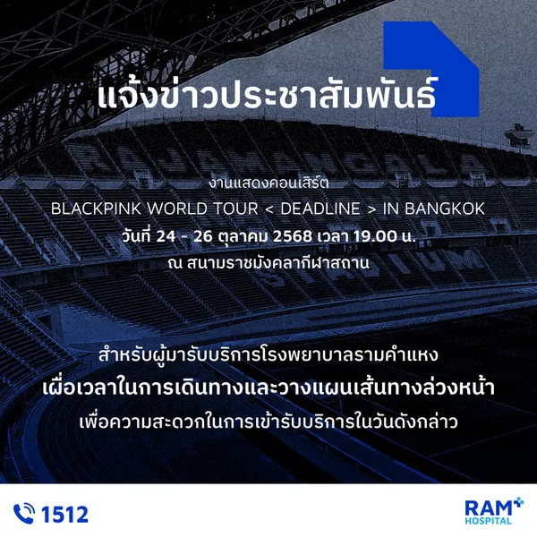 เนื่องจากวันที่ 24 -26 ตุลาคม 2568 เวลา 19.00 น. จะมีการจัดกิจกรรมคอนเสิร์ต BLACKPINK WORLD TOUR < DEADLINE > IN BANGKOK ณ สนามราชมังคลากีฬาสถาน การกีฬาแห่งประเทศไทย คาดว่าจะมีผู้เข้าร่วมเป็นจำนวนมาก อาจส่งผลให้การจราจรบนถนนรามคำแหงและพื้นที่ใกล้เคียงติดขัด