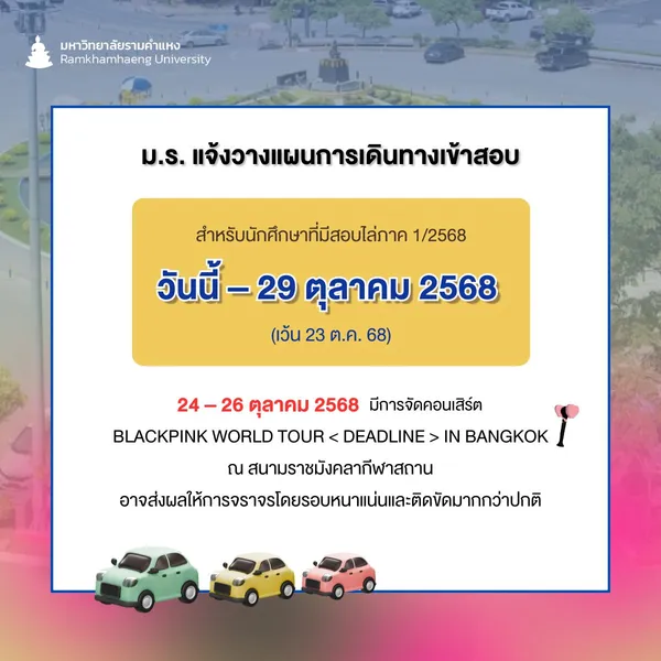 อีกทั้ง ยังจะมีการจัดคอนเสิร์ต BLACKPINK WORLD TOUR < DEADLINE > IN BANGKOK ในวันที่ 24 – 26 ตุลาคม 2568 ณ สนามราชมังคลากีฬาสถาน ซึ่งอยู่ใกล้กับมหาวิทยาลัย อาจส่งผลให้การจราจรโดยรอบหนาแน่นและติดขัดมากกว่าปกติ