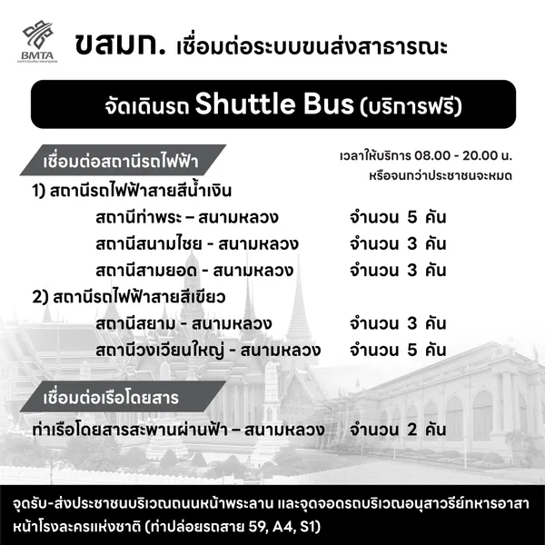 บริการรถฟรีดังกล่าวจะเริ่มให้บริการตั้งแต่เวลา 08.00 – 20.00 น. หรือจนกว่าประชาชนจะเดินทางออกจากพื้นที่จนหมด