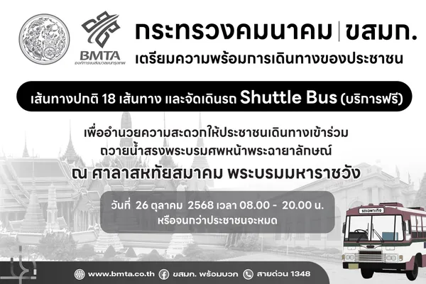 กระทรวงคมนาคม และองค์การขนส่งมวลชนกรุงเทพ (ขสมก.) เตรียมความพร้อมอำนวยความสะดวกประชาชนที่จะเดินทางเข้าร่วมถวายน้ำสรงพระบรมศพ สมเด็จพระนางเจ้าสิริกิติ์ พระบรมราชินีนาถ พระบรมราชชนนีพันปีหลวง เบื้องหน้าพระบรมฉายาลักษณ์ ในวันที่ 26 ตุลาคม 2568 ณ ศาลาสหทัยสมาคม พระบรมมหาราชวัง
