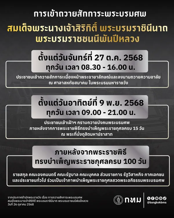 ประกาศสำนักพระราชวัง 26 ตุลาคม 2568 เรื่อง การถวายสักการะพระบรมศพ สมเด็จพระนางเจ้าสิริกิติ์ พระบรมราชินีนาถ พระบรมราชชนนีพันปีหลวง
