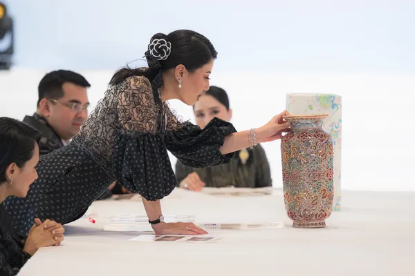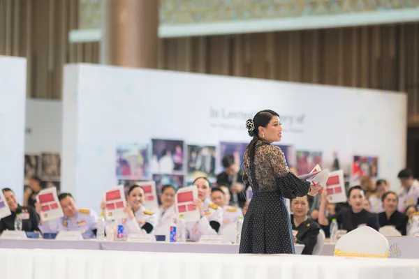 เมื่อเสด็จถึง ทรงพระดำเนินไปทอดพระเนตรนิทรรศการการประกวดผ้าลายพระราชทาน “ผ้าลายสิริราชพัสตราภรณ์” และงานหัตถกรรม แล้วจึงทรงพระดำเนินไปประทับยืนรำลึกในพระมหากรุณาธิคุณ สมเด็จพระนางเจ้าสิริกิติ์ พระบรมราชินีนาถ พระบรมราชชนนีพันปีหลวง แล้วจึงประทับที่โต๊ะทรงงาน เพื่อทรงตัดสินลายผ้าพระราชทานและงานหัตถกรรมร่วมกับคณะกรรมการจากกรมการพัฒนาชุมชน กระทรวงมหาดไทย และคณะกรรมการกิตติมศักดิ์ โดยมีประชาชนที่ผ่านการคัดเลือกเข้าประกวดระดับประเทศ เข้าเฝ้าฯ ถวายรายงาน จำนวน 59 ชิ้นงาน จำแนกเป็น ประเภทผ้า 54 ผลงาน และประเภทหัตถกรรม 5 ผลงาน