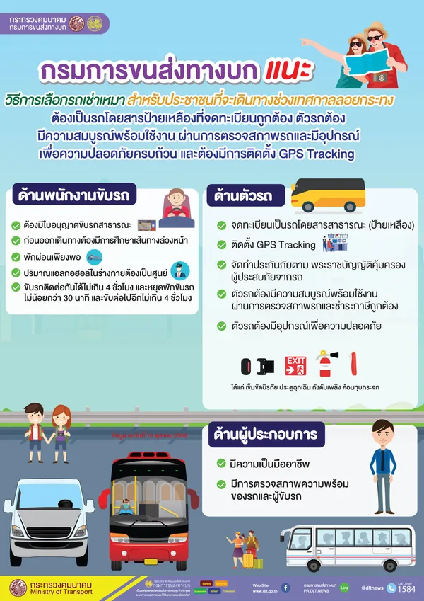 กรมการขนส่งทางบก (ขบ.) จึงขอแนะนำวิธีการเลือกเช่าเหมารถโดยสารในการเดินทางเพื่อความปลอดภัย ดังนี้
