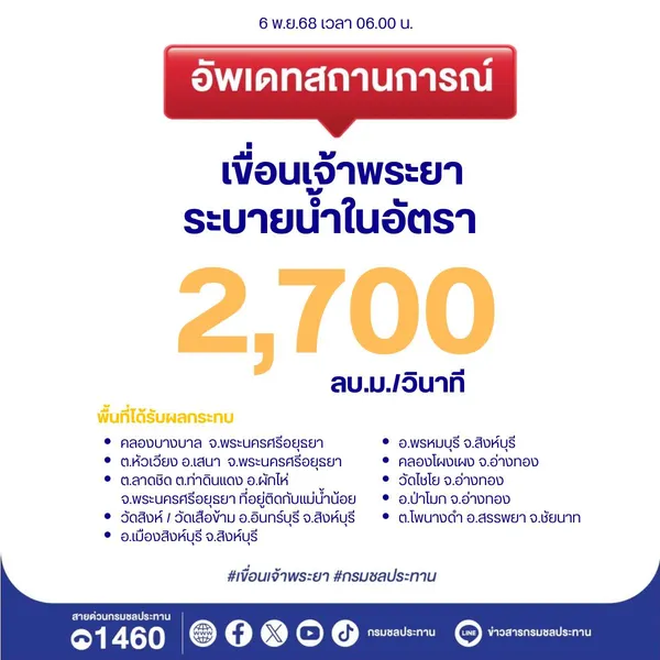 กรมชลประทาน อัปเดตสถานการณ์น้ำเจ้าพระยา วันที่ 6 พฤศจิกายน 2568