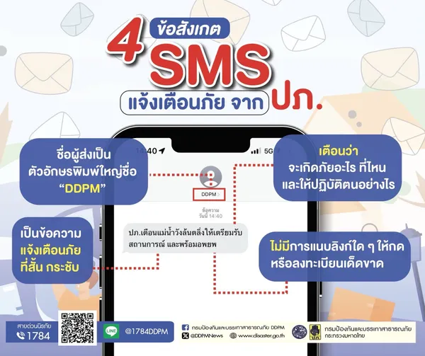 นอกจากนี้ ปภ. ยังมีช่องทางในการแจ้งเตือนภัยผ่านระบบ SMS โดยชื่อผู้ส่งจะเป็นตัวอักษรพิมพ์ใหญ่ “DDPM” ย่อมาจากชื่อภาษาอังกฤษของหน่วยงาน Department of Disaster Prevention and Mitigation ซึ่งเป็นข้อความแจ้งเตือนภัยที่สั้น กระชับ ไม่มีการแนบลิงก์ให้กดหรือลงทะเบียนใด ๆ และระบบแจ้งเตือนภัยผ่านสัญญาณโทรศัพท์เคลื่อนที่ (Cell Broadcast) ที่จะแสดงข้อความเตือนภัยขึ้นอัตโนมัติบนหน้าจอโทรศัพท์มือถือ