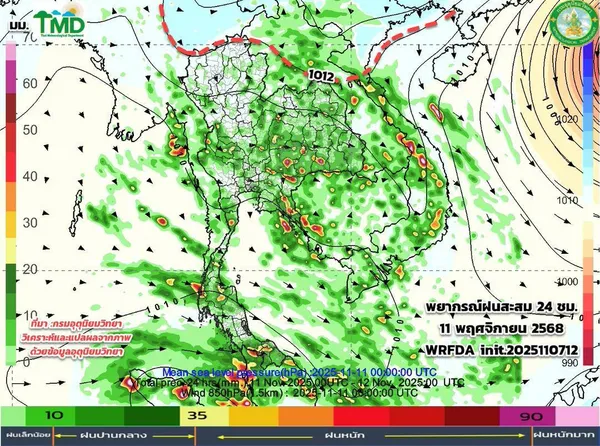 กรมอุตุนิยมวิทยา พยากรณ์ฝนสะสมรายวัน (ทุกๆ 24 ชม.:(นับตั้งแต่ 07.00น. ถึง 07.00น.วันรุ่งขึ้น) และลมที่ระดับ 850hPa (1.5 กม.)10 วันล่วงหน้า ระหว่าง 8-17 พ.ย.68