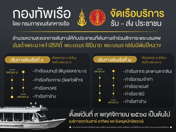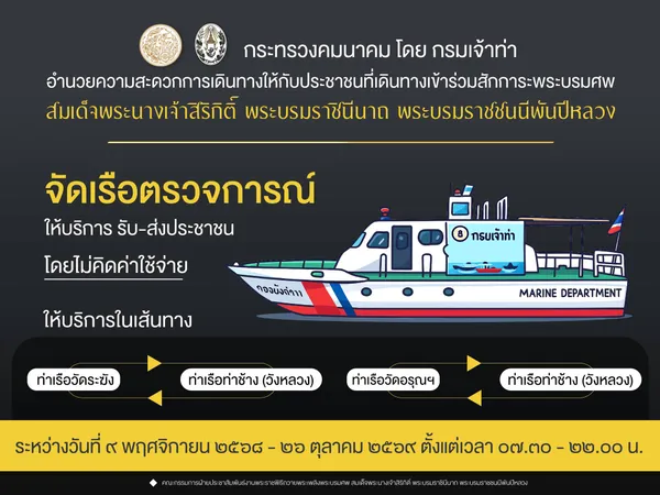 กระทรวงคมนาคม โดย กรมเจ้าท่า อำนวยความสะดวกการเดินทางให้กับประชาชนที่เดินทางเข้าร่วมสักการะพระบรมศพ สมเด็จพระนางเจ้าสิริกิติ์ พระบรมราชินีนาถ พระบรมราชชนนีพันปีหลวง จัดเรือตรวจการณ์ ให้บริการ รับ-ส่ง ประชาชน โดยไม่คิดค่าใช้จ่าย ตั้งแต่เวลา 07.30 - 22.00 น.