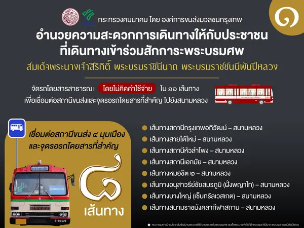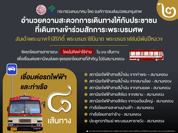 กรุงเทพมหานคร (กทม.) แนะนำบริการขนส่งสาธารณะประเภทต่างๆ มายังสนามหลวง เชื่อมต่อสถานีขนส่ง จุดจอดรถสำคัญ ท่าน้ำ ท่าเรือ จักรยานยนต์จิตอาสา และแนะนำจุดจอดรถใกล้เคียง เพื่ออำนวยความสะดวกการเดินทางให้กับประชาชนที่เดินทางเข้าร่วมสักการะพระบรมศพ สมเด็จพระนางเจ้าสิริกิติ์ พระบรมราชินีนาถ พระบรมราชชนนีพันปีหลวง เริ่มให้บริการตั้งแต่วันที่ 9 พฤศจิกายน 2568 เป็นต้นไป