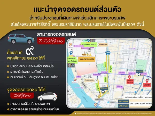 แนะนำจุดจอดรถยนต์ส่วนตัว สำหรับประชาชน ที่เดินทางเข้าร่วมสักการะพระบรมศพสมเด็จพระนางเจ้าสิริกิติ์ พระบรมราชินีนาถ พระบรมราชชนนีพระพันปีหลวง ดังนี้