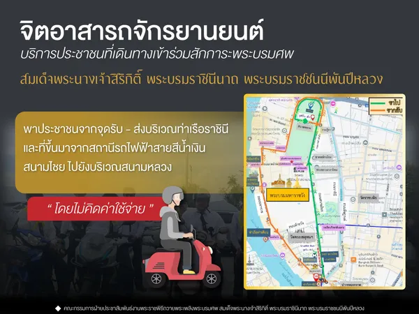 จิตอาสารถจักรยานยนต์ บริการประชาชนที่เดินทางเข้าร่วมสักการะพระบรมศพสมเด็จพระนางเจ้าสิริกิติ์ พระบรมราชินีนาถ พระบรมราชชนนีพระพันปีหลวง