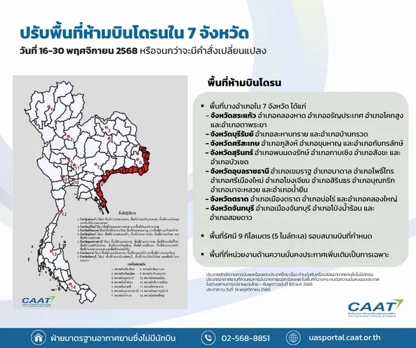 สำนักงานการบินพลเรือนแห่งประเทศไทย (กพท.) หรือ CAAT ออกประกาศฉบับที่ 10 เรื่อง “ห้ามบังคับหรือปล่อยอากาศยานซึ่งไม่มีนักบิน (Drone) ในพื้นที่ที่อาจกระทบต่อความมั่นคงของประเทศในช่วงสถานการณ์ชายแดนไทย–กัมพูชา” โดยขณะนี้สถานการณ์ภาพรวมยังอยู่ในระดับที่ต้องเฝ้าระวังอย่างใกล้ชิด หน่วยงานด้านความมั่นคงได้ประสาน CAAT ให้ยังคงกำหนดพื้นที่ห้ามบินโดรนโดยเด็ดขาดในระดับอำเภอของ 7 จังหวัด มีผลบังคับใช้ตั้งแต่วันที่ 16-30 พฤศจิกายน 2568 หรือจนกว่าจะมีประกาศเปลี่ยนแปลง