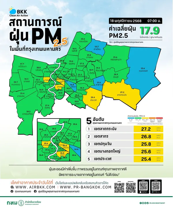 ศูนย์ข้อมูลคุณภาพอากาศกรุงเทพมหานคร ขอรายงานสถานการณ์ฝุ่นละอองขนาดไม่เกิน 2.5 ไมครอน (PM 2.5) ในกรุงเทพมหานคร ประจำวันที่ 18 พฤศจิกายน 2568 เวลา 07:00 น.