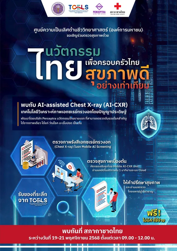 เพื่อให้ประชาชนเข้าถึงการดูแลสุขภาพอย่างเท่าเทียม TCELS เปิดบริการโดยไม่คิดค่าใช้จ่าย ประกอบด้วย: ตรวจเอกซเรย์ปอดด้วย AI-CXR (Mobile AI Screening) พบแพทย์ประเมินผลและให้คำปรึกษา รับของที่ระลึกจาก TCELS ทุกบริการ ฟรี 100% วันที่ 19–21 พฤศจิกายน 2568 เวลา 09.00–12.00 น. ณ สภากาชาดไทย