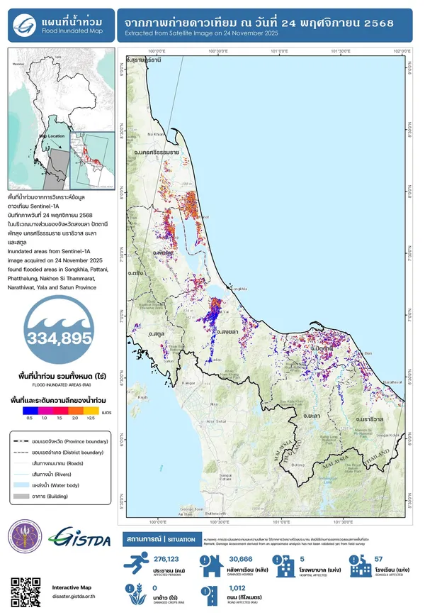 GISTDA รายงานสถานการณ์ล่าสุดของวันที่ 24 พฤศจิกายน 2568 ด้วยข้อมูลภาพถ่ายจากดาวเทียม Sentinel-1A เพื่อสนับสนุนการบริหารจัดการน้ำท่วมในพื้นที่ภาคใต้ของไทย โดยข้อมูลจากดาวเทียมพบพื้นที่ที่มีน้ำท่วมขังรวมประมาณ 334,895 ไร่ ในพื้นที่บางส่วนของ 7 จังหวัด ได้แก่: